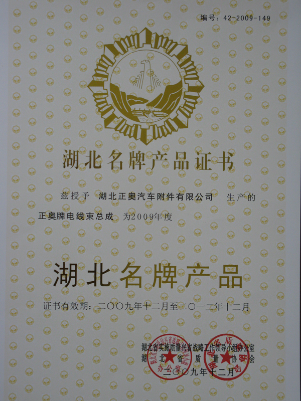 我公司生產(chǎn)的“正奧”牌電線束榮獲湖北省名牌產(chǎn)品稱號